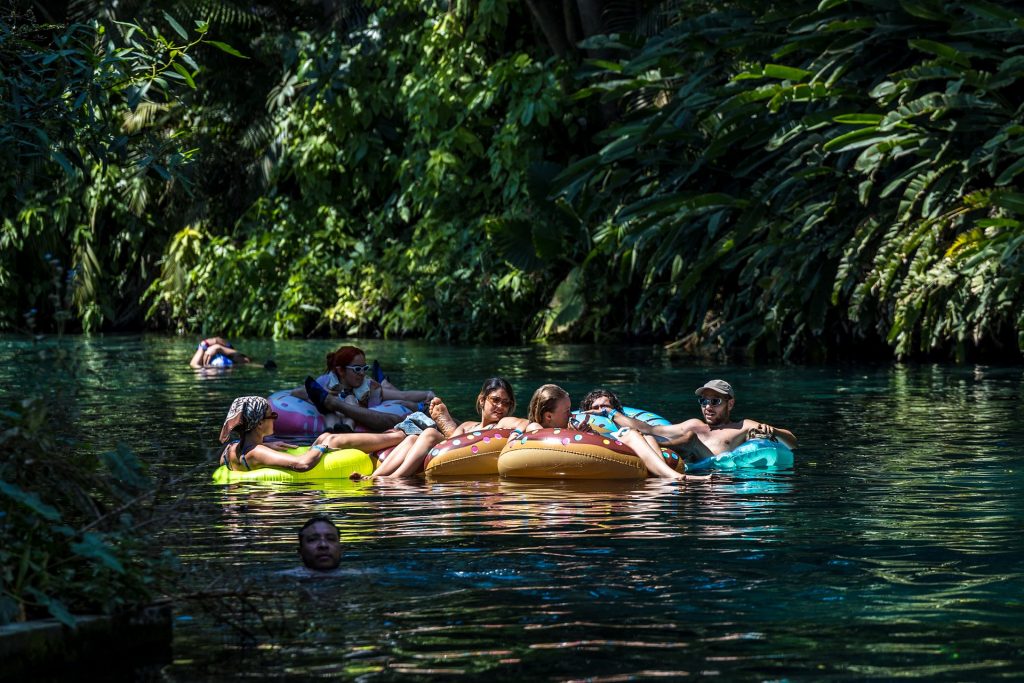 Bahidorá sucede junto a un río de agua turquesa, rodeado de selva y vegetación exuberante. Aquí puedes: